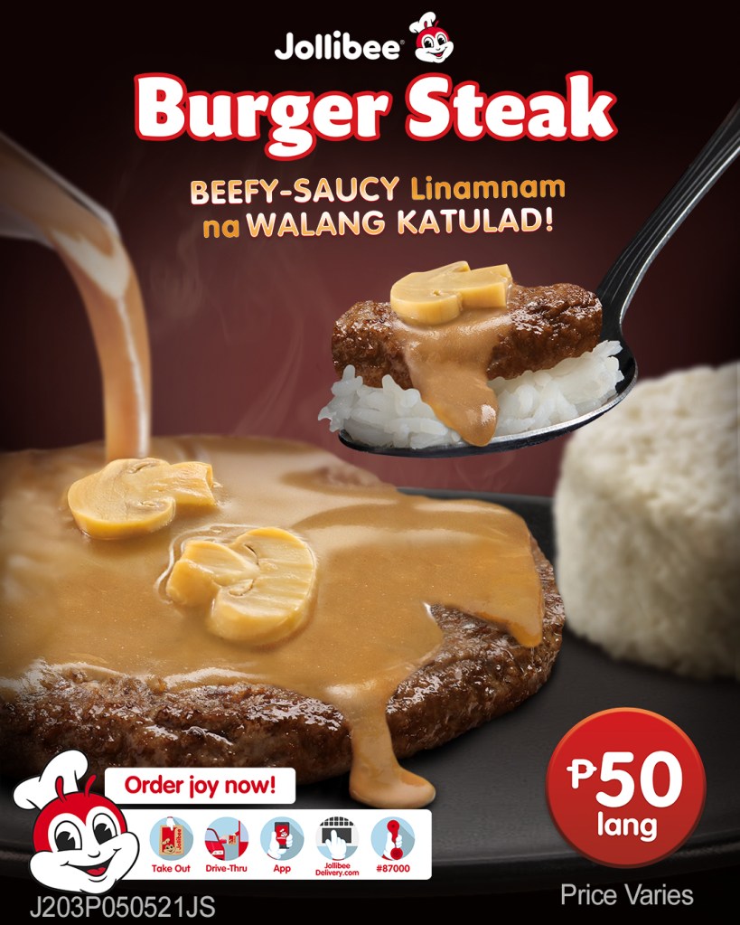 Enjoy your favorite Jollibee Burger Steak any time for only Php 50 solo, and P69 as a value meal with drink. Have it safely delivered to you via the Jollibee Delivery App, JollibeeDelivery.com, #87000, GrabFood, or foodpanda! It’s also available in Drive-Thru and Take Out.