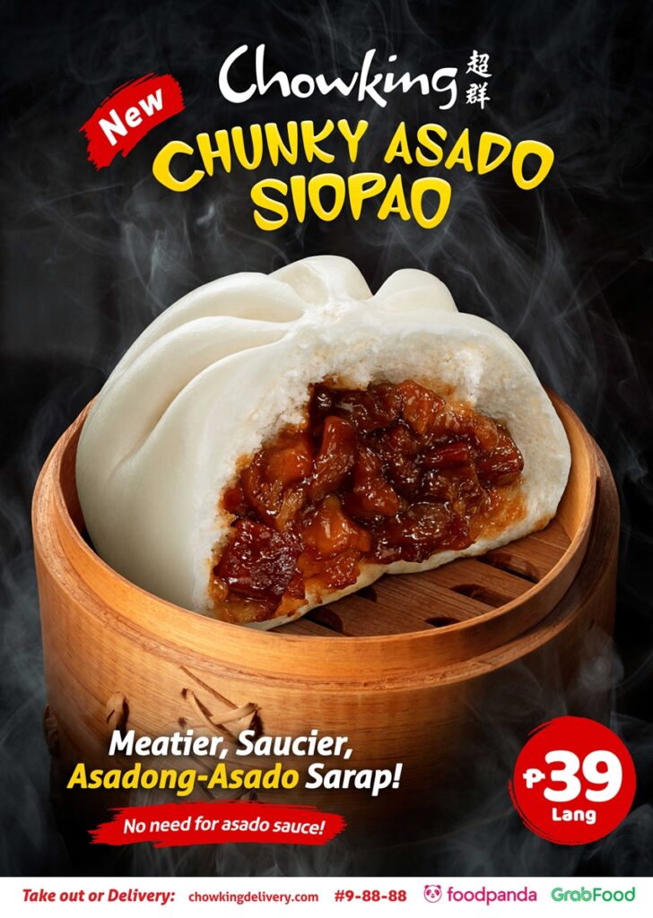 Get a taste of the meatier and saucier Chowking Chunky Asado Siopao for P39 each, or in 3-piece takeout boxes for only P115. Get your delivery via Chowking’s hotline #9-88-88, ChowkingDelivery.com, or Grab or foodpanda; or pass by a Chowking store for drive-thru or take out.