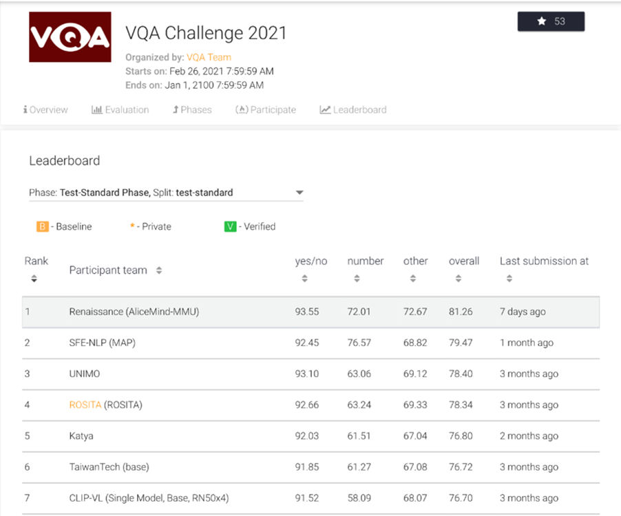 The Challenge, organized annually since 2015 by the worldwide leading visual conference CVPR, attracts global players including Facebook, Microsoft and Stanford University. The evaluation presents an image and a related natural language question, to which participants are asked to provide an accurate natural language answer. This year, the challenge contained more than 250,000 images and 1.1 million questions.